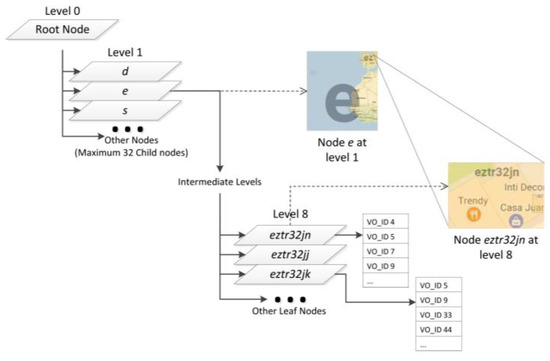 Algorithm 1 shows the algorithm for inserting a new value into the Geohash Grid Tree. During insertion, the tree receives a VO with a VO_ID and spatial information expressed as a latitude-longitude pair. The steps of indexing a VO into the tree structure can be summarized as follows: