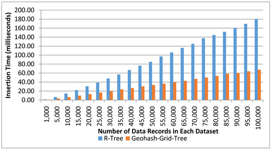 Figure 5 shows the average indexing time using the two methods on different number of data records. Both tree structures took approximately linear time for indexing. R-Tree took around 180 ms to index 100,000 data records, while the proposed Geohash-Grid Tree method only took about 67 ms to index the same number of data records. The proposed method reduced around 43% time for indexing compared to R-Tree for 100,000 data records insertion. The index creation time is much shorter for the proposed method due to its fixed tree structure where indexed values are stored directly at the leaf nodes. It does not suffer from the tree balancing or reorganization problem, which is an expensive operation and inherent in the R-Tree.