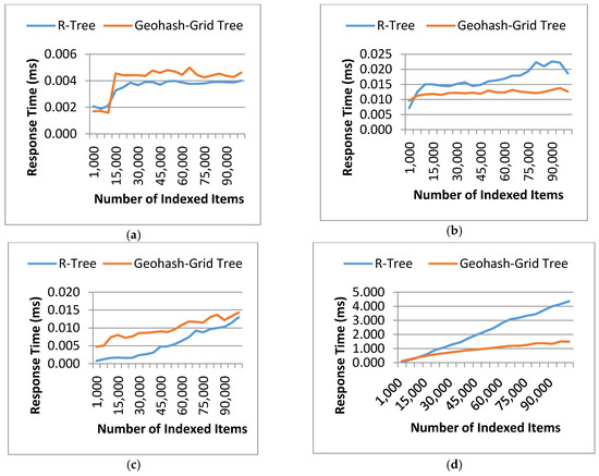 Tree response time: Geohash-Grid Tree and R-Tree. (a) Query 1: point matching in a sparse area; (b) Query 2: point matching in a dense area; (c) Query 3: range matching in a sparse area; (d) Query 4: range matching in a dense area.