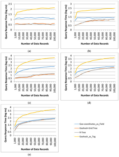 Query 1 returned 1 data record for 3 of the methods, this is because there is just one data record for the temporal parameter specified in the query but all the VOs in the dataset fall within the spatial range of the query (hence, are returned by the indexing tree structure). Queries 2 and 4 retrieved data in a relatively dense area and retrieved 46 VOs. Query 5 specified a long temporal range (6 months) and a spatial range in a dense area, and retrieved 58 VOs. As the VOs in the spatial range of Query 5 repeatedly traversed the area, it retrieved much more matched data records than Query 4. The results for the query response time using the four different methods were plotted in a log scale in Figure 7. The indexed Geohash_as_Tag approach performed the worst, taking 138.30 ms for Query 1, 313.37 ms for Query 2, 4895.08 ms for Query 3, 4852.11 ms for Query 4 and 4972.48 ms for Query 5 for database containing 100,000 data records. These numbers were an order of magnitude different from that of the other methods. The large response time was due to the fact that generation of an overlapped geohash string enlarged the spatial range significantly. This resulted in many non-related data records that were outside the spatial range of the query, being retrieved from InfluxDB. This can be seen from Table 7, for Query 1, 616 data records were retrieved from the dataset, and for Query 5, 93,404 data records were retrieved from the largest database in the experiments.