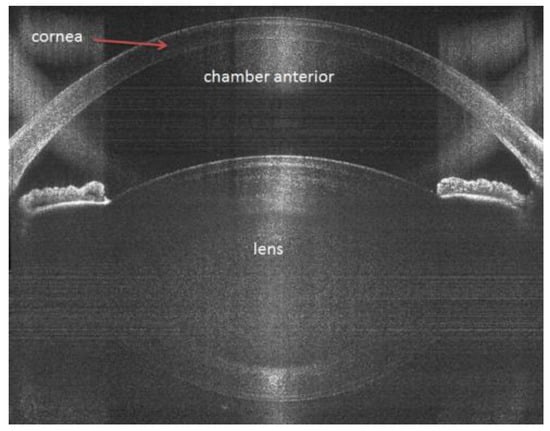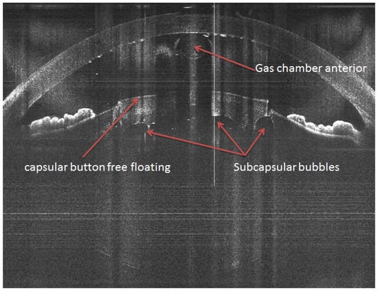 The suction ring of a disposable liquid–patient interface was applied to the eye with centration over the limbus. The system contains a liquid interface (no applanation), which prevents posterior corneal descemet folds, ensuring an unhindered laser beam transmission. As soon as the suction vacuum reached 400 mbar, the suction ring was filled with a balanced salt solution (BSS). The handpiece, which is attached to an articulating arm of the laser system, was docked over the corneal apex. In the handpiece, there is a color camera and an integrated ocular coherence tomography (OCT) system that images the ocular structures. Treatment parameters were customized to accommodate each individual patient. Custom surgical planning is performed by the precise placement of surgical incisions based on OCT images that identify ocular structures and automatically determine and display safety margins and suggested cut locations. Via a touchscreen, the surgeon has the ability to reposition treatment patterns. Laser treatment begins with lens fragmentation (an eight-piece pie-cut pattern) followed by anterior capsulotomy (5.0 mm in diameter). Unlike other FLACS systems, lens fragmentation before anterior capsulotomy is possible with the Z8, as the low energy results in minimal gas production, which significantly reduces the risk of intra-operative complications. As shown in Figure 5, the capsular button in the OCT image can be seen free-floating, while the fragmented lens shows no accumulation of gas.