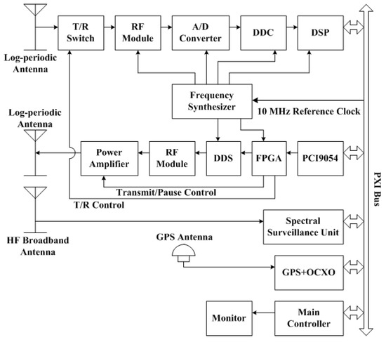 In 2009, the third version of WIOBSS was successfully developed by Yang et al. [61,62,63]. On the one hand, the time and frequency synchronous controller in which a high-performance OCXO is disciplined by the Global Positioning System (GPS) was designed by Shi et al. [64]. With this module, WIOBSS can not only be configured as a bistatic radar to achieve the oblique-incidence sounding at the time of the oblique backscatter sounding [65,66], but can also be configured as a multistatic radar to detect the target in a much larger surveillance area and to extract more information from the target [67], such as the ionospheric oblique-incidence sounding network [68]. On the other hand, according to the specification of the Peripheral component interconnect eXtensions for Instruments (PXI) bus (which has been reported as high-performance and functional, reliable, easy to integrate and use, cost-effective, and portable [69]), the system was designed as a modular and compact PXI-based system. As shown in Figure 2, it consisted of a main controller, a transmitting channel, a digital receiver, antenna systems, a synchronous controller, a spectral surveillance unit, and a solid-state power amplifier. Except for the antenna systems and the power amplifier, the whole system was designed as one PXI bus shielded 6U-sized (233.35 × 160 mm2) module and five PXI bus shielded 3U-sized (100 × 160 mm2) modules, and its dimensions were 177.8 mm × 431.8 mm × 457.2 mm. All modules were inserted into a PXI bus mainframe PXI-1056 from National Instruments Corporation. In order to reduce the external cable connections, the trigger bus and the local bus distributed in the PXI backplane were used to transfer the analog signals and the high-speed digital signals among modules. Furthermore, an embedded main controller PXI-8106 running in Windows XP was adopted as the control center to replace the personal computer, and a spectral surveillance unit was used to measure the background external noise spectral density and to monitor the channel occupancy of the HF band. In addition, the sounding waveform generated by the AD9857 was first filtered by a 3–30 MHz band-pass filter, then amplified by a low-noise amplifier and filtered by the eight-band sub-octave filters, and finally sent to the power amplifier. With this design, the generated waveform can be an arbitrarily designed waveform, and the harmonic and other unwanted signals can be removed well without distorting the phase of the emitted signal. Since the operating principle of the vertical-incidence sounding is very similar to that of the oblique backscatter sounding, Yao et al. used the intra-pulse pseudorandom binary phase-coding technique to achieve the function of vertical-incidence sounding for the third version of WIOBSS in 2010 [70]. Using this system, the oblique backscatter ionogram and Doppler ionogram can be obtained in the range of 2500 km with a power of about 200 W, and the vertical- and oblique-incidence sounding results can be clearly obtained with a power of no more than 100 W [71]. Moreover, a new sounding mode (i.e., the frequency hopping mode) was added to acquire the ionospheric state over several frequency bands of interest, to avoid radio frequency interference, and to reduce the cause of interference to other HF systems [72].