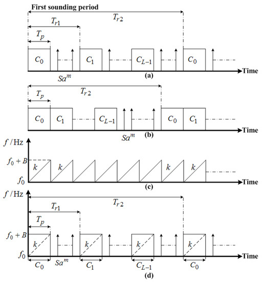 Sounding timing of the four types of waveforms employed in WIOBSS. (a) The inter-pulse binary phase-coded pulse trains. (b) The intra-pulse binary phase-coded waveform. (c) The linear frequency-modulated continuous waveform (LFMCW). (d) The inter-pulse pseudo-random binary phase-coding waveform where the sub-pulse uses the chirp modulation. represents the pulse width, denotes the length of the coding sequence, denotes the pulse repetition period, denotes the sequence repetition period, is the element of {+1, −1} in a pseudo-random coding sequence, , represents the received echo at the mth range bin, is the chirp rate, represents the initial center frequency of the chirp signal, and is the sweep bandwidth of the chirp signal.