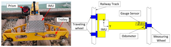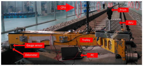 Nowadays the railway track surveying trolley is widely used in railway construction and maintenance projects. The GRP1000 track surveying trolley provided by the Swiss company Amberg Technologies (Regensdorf, Switzerland) and the GEDO CE one provided by Sinning (Wiesentheid, Germany) are widely deployed in China [2]. These kinds of trolleys equipped with optical total stations can measure the track position with millimeter or even sub-millimeter accuracy in stop-and-go mode [1,2]. Another representative track surveying trolley, namely the Swiss trolley [1,4], was developed by the Institute of Geodesy and Photogrammetry at ETH Zurich in collaboration with a number of others. Glaus [1] describes this trolley thoroughly and comprehensively in his thesis. The basic configuration of the Swiss trolley contains an inclinator, track gauge measuring system and odometer, enabling the assessment of the cant, gradient, track gauge, chainage and twist parameters. The positioning configuration equipped with Real Time Kinematic GPS (GPS-RTK) and optical total stations allows for absolute position fixing. Glaus designed two Kalman filter models and a smoother to fuse the data measured by GPS and other sensors to improve the measurement precision.