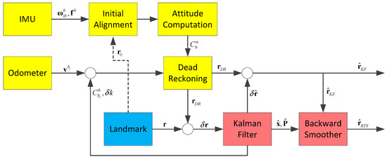 The system makes use of the attitude measured by the gyro assembly and the velocity or distance increment measured by the odometer for dead reckoning. When the system comes across a landmark, a position observation updates, and the Kalman filtering and smoothing algorithm is executed to output the optimized position measurements of the interval. The initial attitudes of the system can be provided by initial alignment of the IMU or some other methods.