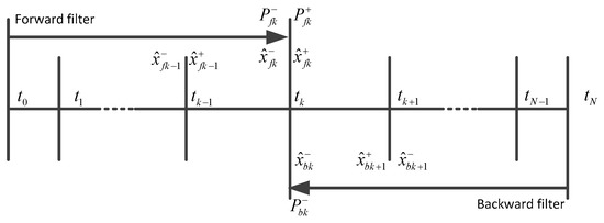 The positions measured by total station are considered as updates for the Kalman filter, and thus, the position errors as well as the covariance information of the integrated IMU/odometer/landmark solution will be very small at the observation points. However, the position errors and their covariance increase with time between two observation points due to the residual system errors. In order to obtain accurate positions during the observation outages, a bridging algorithm must be used for estimating improved positions for these periods. This is a typical fixed interval smoothing problem. The Two-Filter Smoother (TFS) and the Rauch-Tung-Striebel (RTS) smoother are two classical smoothing methods [9,18]. The TFS includes a forward Kalman filter and a backward Kalman filter, and the smoothed estimate of state vector is calculated by combining the forward and the backward filtered solutions. Figure 3 illustrates the computation procedure.