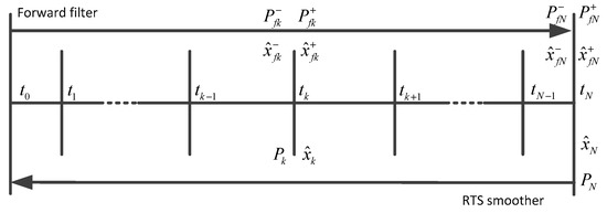 The RTS smoother consists of a common forward Kalman filter and a backward smoother. The backward sweep begins at the end of the forward Kalman filter. Figure 4 illustrates the computation procedure of the RTS smoother.
