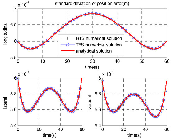 The standard deviations of position errors calculated by the analytical solution and numerical solution of the RTS algorithm and TFS algorithm are shown in Figure 5. As Figure 5 illustrates, the analytical solution of the covariance matrix is identical with numerical solution and the smoothing effect of RTS and TFS are equivalent.