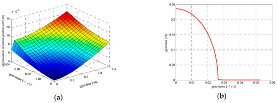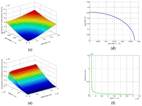 (a) Theoretical standard deviation of lateral position error; (b) The relationship of drifts for the equivalent vertical gyro; (c) Theoretical standard deviation of vertical position error; (d) The relationship of drifts for the equivalent lateral gyro; (e) Theoretical standard deviation of longitudinal position error; (f) The relationship of drifts for the odometer.