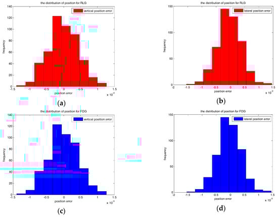 (a) The distribution of vertical position error for the RLG-based IMU; (b) The distribution of lateral position error for the RLG-based IMU; (c) The distribution of vertical position error for the FOG-based IMU; (d) The distribution of vertical position error for the FOG-based IMU.