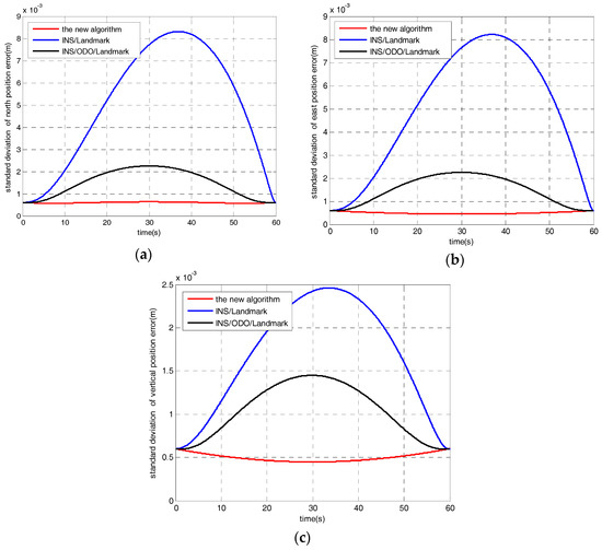 Secondly, surveying accuracy simulations for the proposed algorithm compared with traditional filtering algorithms, namely INS/landmark integration and INS/odometer/landmark integration, have been carried out based on the numerical analysis of covariance. The gyro drifts are set to 0.01°/h of bias instability and 0.005°/ of random walk noise. The accelerometer drifts are set to 10 μg of bias instability and 5 of random noise. Setting T = 60 s, v = 1 m/s, and position observations are provided at the end of the time. The RTS smoothers are employed when the process of forward filtering is finished for all algorithms. The simulation results are shown in Figure 8, which illustrates, that the surveying accuracy of the proposed algorithm is better than that of the traditional filtering algorithms based on INS or INS/odometer integrations. The bias of the inertial sensors cannot be estimated well under railway surveying applications by the traditional algorithms, which need inertial sensors of higher precision grade for long distance interval surveying or more high accuracy position updates.