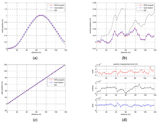 (a) The north position measurements; (b) The vertical position measurements; (c) The east position measurements; (d) The position measurement errors of north, east and vertical directions.