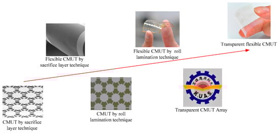 The purpose of this research is to develop a novel fabrication process for a transparent flexible CMUT so the CMUT can be applied in a display panel for finger hovering that provides a more advanced human-machine interface than the existing touch panel. A new roll-lamination fabrication technique is proposed for the mass production of CMUTs at low temperature. The roll-lamination method minimizes the residual stress introduced at high temperature if a bonding process is used. This fabrication method is also simpler than the sacrificial-layer technique. Three different transparent electrodes, indium tin oxide (ITO), aluminum-doped zinc oxide (AZO), and silver nanowire, are fabricated and tested in our CMUTs. The transparent electrodes on the vibrating membranes must survive ultrasonic vibration under long term operation. The performance characteristics of the transparent flexible CMUT are tested on flat and curved surfaces. The proposed CMUT can be easily integrated with display panels and lighting systems for non-contacting sensing and control in the future. Figure 1 shows the research progress of our group over the years.