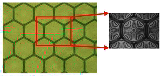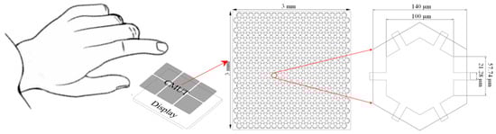 The proposed transparent CMUT has a surface area of 3 mm × 3 mm and comprises 416 hexagon-inscribed vibrating membranes with a diameter of 140 µm, as illustrated in Figure 2. The ITO-PET substrate was 125 µm in thickness, the sidewall was 10 µm in width, the cavity was 2 µm in depth, and the vibrating membranes, which sandwiched a 0.2 µm thick silver nanowire (SNW) transparent electrode, were 5 µm in thickness as shown in Figure 3. The design dimensions are listed in Table 1. A total of 72 CMUTs with an overall size of 8 cm × 6 cm were fabricated on a 4-inch silicon wafer.