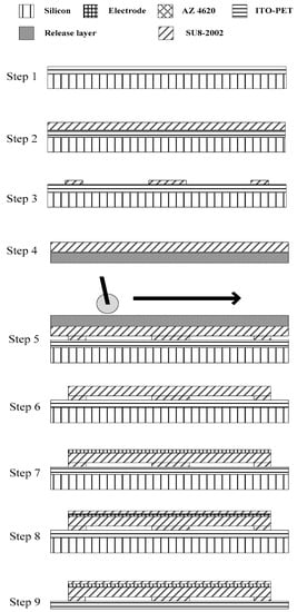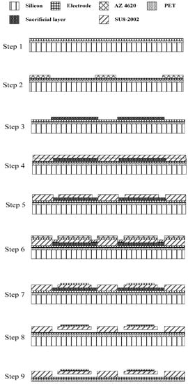 The fabrication of the transparent flexible CMUT was built on a polymer-based CMUT using sacrificial-layer techniques developed earlier. The polymer-based CMUT applied a PET substrate and SU-8 structure and membrane. It was not transparent because platinum and gold were used for the electrodes. The sacrificial-layer fabrication procedure of the polymer-based CMUT, depicted in Figure 4, is described as follows:
