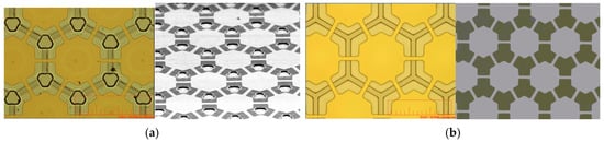 Figure 6a,b illustrate two CMUTs made respectively by the sacrificial-layer and roll-lamination techniques. Both figures show top electrodes made of gold because the electrode patterns are not clear with silver nanowire. The left and right images were obtained using an optical microscope (OM) and scanning electron microscope (SEM). The etching holes from the sacrificial-layer technique are clearly shown in Figure 6a, whereas there was no hole seen through the roll-lamination technique in Figure 6b.