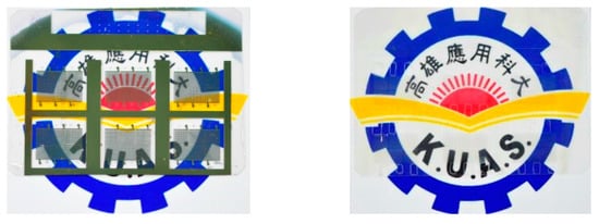 Successful lamination of vibrating membranes onto the sidewall depends largely on the lamination pressure. When the lamination pressure is below 0.3 MPa, the membranes and sidewall fail to bond; when the lamination pressure is over 0.6 MPa, the sidewall becomes deformed. A Fuji Prescale film is used to measure the lamination pressure and its uniformity on the membranes; this is achieved by placing the film on the PET release layer, observing the color change on the release layer following lamination (yellow: >0.6 MPa; red: 0.3–0.6 MPa; green: <0.3 MPa), and measuring the levels of lamination pressure on the four regions (upper, lower, left, and right) of the release layer. Figure 9 illustrates the lamination pressure distribution on four Prescale films tested by applying various pressure levels. In Sample 1, the lamination pressure has an average of 0.35 MPa and is more uniform on the left half than on the right half; the membranes on the right half region indicated by the green color could not be laminated onto the sidewall. In Sample 2, the lamination pressure was uniform with an average of 0.39 MPa across all the regions; thus, this sample represented the highest success rate among the four samples. In Sample 3, the lamination pressure has an average of 0.4 MPa and the central region has better lamination compared with the surrounding regions. In Sample 4, the lamination pressure was not uniform with an average less than 0.31 MPa; thus, this sample represented the lowest success rate. Note that the best lamination pressure is between 0.35 and 0.55 MPa.