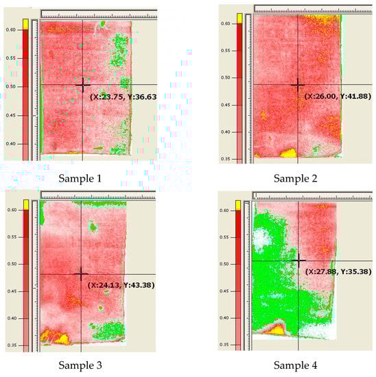 Lamination pressure distribution on four Prescale films. The red color indicates good bonding pressure; the green color with lower pressure leads to bonding failure; the yellow color with higher pressure causes the sidewall deformed. Sample 1 has good lamination on the left half region but not right half region; sample 2 with an uniform and correct pressure is the best among four samples; sample 3 applied uneven pressure leads to good lamination in the central region but not surrounding regions; sample 4 with lower than ideal pressure is the worst.