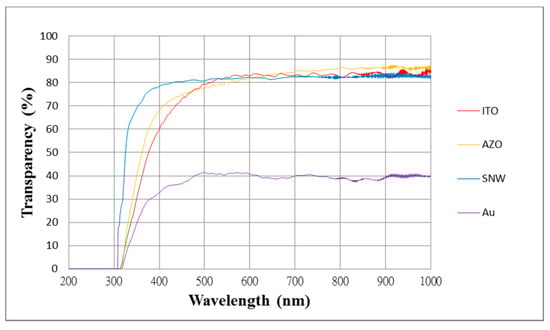 Transmittance measurements of CMUTs with gold, ITO, aluminum-doped zinc oxide (AZO), and silver nanowire top electrodes.
