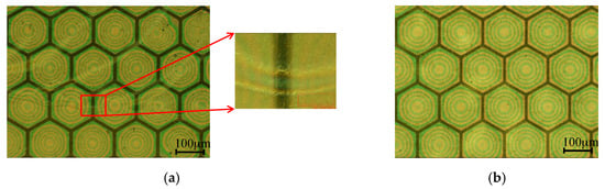 (a) Surface warpage observed on a protecting layer after the pulse-echo test; (b) No warpage observed on a 1 μm SU-8 protecting layer after the pulse-echo test.