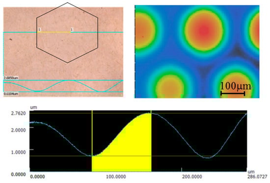 The SU-8 vibrating membranes of the CMUTs swelled initially after fabrication and further expanded after extended use. The swelling behavior is influenced by the baking procedure in photoresist development process and internal stresses in the SU-8 film [36]. The swelling height was obtained by calculating the number of Newton’s rings on the membrane and by using a Keyence VK-X250 3D laser microscope. There were six Newton’s rings observed on the transparent CMUT membranes after fabrication, and this increased to 14 rings after over 24 h of continuous operation, as shown in Figure 14. In addition, the 3D microscope revealed that the swelling height increased from 0.9 to 2.0 µm, as shown in Figure 15. The membrane swelling enlarged the distance between the top and bottom electrodes and caused a reduction in ultrasonic signals of the CMUT.