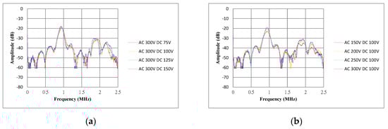(a) Spectra of received signals of the transparent CMUT under AC 300 V and various DC bias voltage; (b) Spectra of received signals of the transparent CMUT under DC 100 V and various AC pulse voltage.
