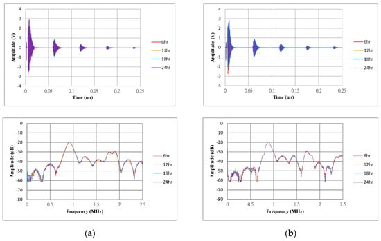 Figure 18a,b present the time and frequency responses of both gold and silver nanowire CMUTs operating for 24 h at the AC 300 V, DC 100 V condition by detecting a flat target at a distance of 10 mm. The maximum amplitudes of the first reflection signal for the gold and silver nanowire CMUT were 860 and 960 mV, respectively. The natural frequencies were 880 kHz for both CMUTs. There is no change was observed during 24 h of operation.