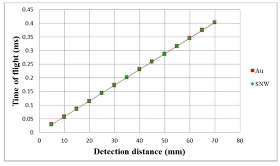 Figure 19 shows the detection distance versus time of flight experiments for both gold and silver nanowire CMUTs. The experiments were conducted at room temperature 25 °C with the target distances ranging from 5 to 70 mm in 5 mm increments. Each measurement was repeated three times. The propagation speeds for the gold and silver nanowire CMUTs were 347.5 m/s and 346.5 m/s, respectively. The linearity errors of the displacement were 0.136 mm and 0.141 mm.