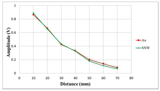 Figure 20 illustrates detection distance versus reflection signal experiments for both gold and silver nanowire CMUTs. The maximum detection distances were 70 mm for both CMUTs. The maximum reflection signals for gold and silver nanowire CMUTs were 864 mV and 888 mV at a 10 mm detection distance, and decreased to 84 mV and 66 mV at 70 mm. There were only slight differences observed for both CMUTs.
