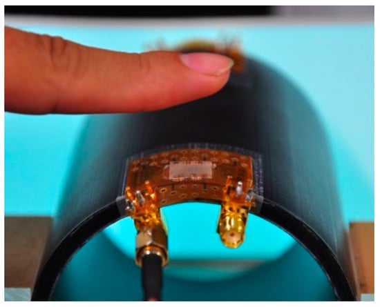 The transparent flexible CMUTs were studied on both flat and curved surfaces to determine the maximum detection distances for curved displays and wearable electronics applications. The CMUTs were mounted on a cylinder with a 40 mm curvature radius to detect flat targets and a finger. The maximum detection distances were determined in 10 mm increments until the reflection signal amplitude diminished to 50 mV. Figure 21 shows a photograph of a finger being detected by the silver nanowire CMUT on a curved surface. Figure 22 presents the experimental results of the CMUT on both flat and curved surfaces to detect a flat target and a finger. Table 3 summaries the reflection signal amplitudes at a distance of 10 mm and the maximum detection distances under different operating conditions. The CMUT on the flat surface obtained a maximum detection distance of 70 mm and 50 mm from the flat target and finger, respectively. The CMUT on the curved surface obtained a maximum detection distance of 50 mm and 40 mm from the flat object and finger.