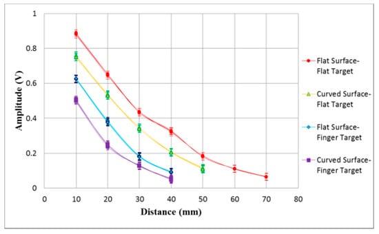 Distance measurement signal of the transparent CMUTs mounted on flat and curved surfaces to detect a flat target and a finger.