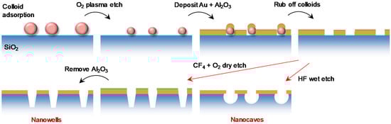 Fabrication steps for preparing ‘nanowells’ and ‘nanocaves’. Colloidal lithography is performed as in previous studies to make nanohole arrays. After removing the colloids, two different etch processes are used to produce the different structures. Anisotropic dry etching creates nanowells while more isotropic wet etching creates nanocaves. The Al2O3 layer (green) is removed in the HF etch process, but it does not influence Au (orange).
