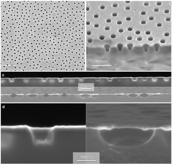 Since these nanostructures should be particularly useful for studying phenomena associated with nanoscale geometry [] it is important to visualize the shape of the cavities in SiO2 underneath Au. A combined focused ion beam (FIB) and SEM was used to perform cross-sections (Figure 2b) and thus reveal the structure of the cavities (Figure 2c). For nanowells, the walls in SiO2 are clearly almost vertical but with a small inclination on the wall. It appears to be widely believed that the RIE process used can result in an undercut for an appropriate amount of O2 in the reactant gases. However, we always observed walls with a slight inclination towards the pore center even when making changes in the RIE recipe. In other words, the bottom of the wells were slightly smaller in diameter than the top aperture regardless of gas ratio, pressure, power, and machine used. The maximum depth of the nanowells prepared in this work was 200 nm but deeper wells up to at least 1 µm can most likely be achieved [].