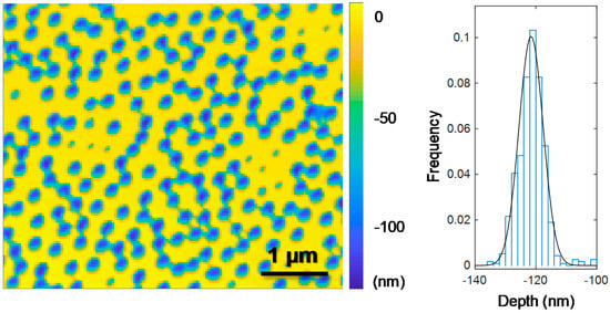 Atomic force microscopy of nanocaves. The Au film has been removed such that only the cavities in SiO2 are visualized. The sample was imaged by contact mode in air. On this sample, a small fraction of the wells have a much lower depth (excluded from the histogram) which is because a fraction of the colloids were not removed before HF etching. This occurs when approaching the limit of smallest possible diameter. Here the colloids were shrunk to 60 nm.