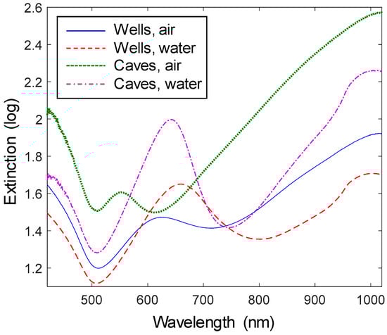 Extinction spectra of nanowells and nanocaves in air and water. The nanowells were 150 nm deep and 120 nm in diameter. The nanocaves were 70 nm in diameter and 100 nm deep. The small increase in extinction at 980 nm in water is due to its absorption band.