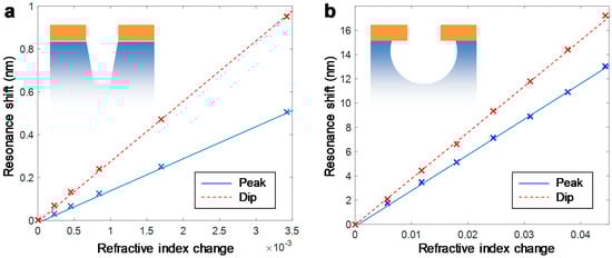 Refractive index sensitivities of (a) nanowells and (b) nanocaves. Note that a wider refractive index interval is analyzed for the nanocaves, but both structures exhibited linear sensitivities from pure water (1.33) up to at least 1.4. For these experiments the nanowells were 150 nm deep and 120 nm in diameter. The nanocaves were 70 nm in diameter and 100 nm deep.