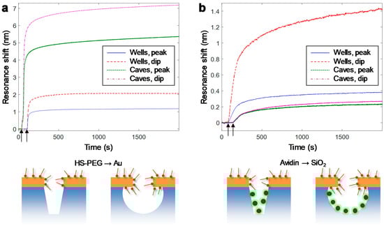 It is clear from Figure 6a that the nanocaves provide higher signals for binding to Au, which makes them preferable from a performance point of view. This is expected when more of the Au surface is available for binding and when the field is higher on the top surface away from the solid support as explained above. For binding to SiO2, the nanocaves clearly give more moderate signals, even though they have a higher SiO2 surface area available. This can be explained by the fact that the SiO2 walls are not close to the pore where the sensitivity is highest. One should also keep in mind that most of the exposed area is Au and not SiO2 in both these structures. The nanowells give a reasonably high dip shift (~1.4 nm) upon protein adsorption inside the cavities. This illustrates that the ideal structure can depend on which material is chemically modified for binding a target. Note that, based on the size of the protein (~5 nm) and the cavities, the signal to noise is sufficient to detect one protein per cavity as long as it binds close to the metal [].