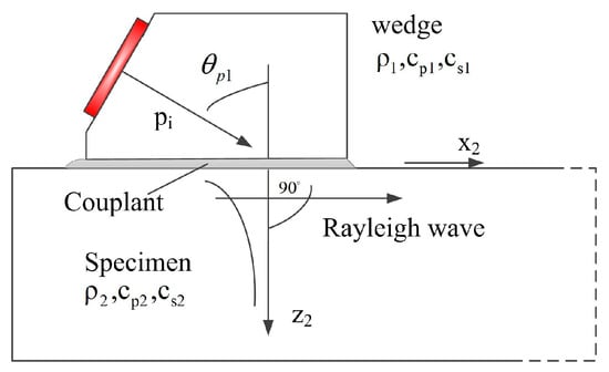 When another angle beam wedge transducer is introduced as the receiver, Rayleigh wave propagates along the specimen-wedge interface but will re-radiate wave energy into the contact wedge, and the reradiated wave is received by the bulk wave transducer. The coupled longitudinal wave re-radiated by Rayleigh wave is measured, and this process is described in Figure 4. In this case, a new boundary condition supporting wave propagation in the smooth contact solid-solid interface should be considered. In addition, the diffraction of the coupled wave propagating in the wedge should be considered; moreover, the effect of the receiver size on the received average wave results in the reception process should be taken into account.