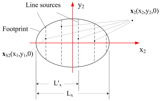 Considering all the contributions from the actual sound source positions, the area sound source can be replaced by these line sources and the line integral formula from Equation (18) can be extended to the following form to express the surface integral as [6]: