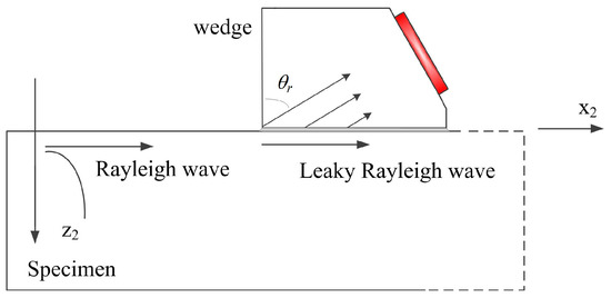 In the boundary conditions of the smooth-contact wedge-specimen interface, the solution to the leaky Rayleigh wave speed will be a complex number, wherein the real part denotes the actual sound speed and the imaginary part implies the attenuation due to the leakage of energy [32,33,34]. In addition, the leaky Rayleigh wave speed is slightly higher than the Rayleigh wave speed, i.e., . When Rayleigh wave propagates on the stress-free surface of the specimen and reaches the smooth contact wedge-specimen interface, it will propagate as the leaky Rayleigh wave and radiates energy into the wedge in the form of a coupled longitudinal wave at a leaky Rayleigh angle, as shown in Figure 4. The leaky angle can be calculated using the Snell’s law as: