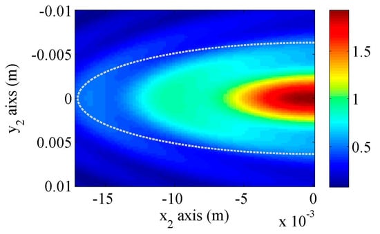 Figure 5 shows the longitudinal wave sound field distribution under the wedge, in which the half-ellipse denotes the exact footprint. The wave fields are numerically calculated using Equation (17) in the (x1y1z1) coordinate. Note that there is a transformation of the coordinate systems, and the sound fields are plotted in the (x2y2z2) coordinate. It is observed that the main energy is concentrated in the footprint although there is energy out of this region because of the wave spreads. Since the wedge width in the y2 direction is much larger than the main beam width, the effects of vertical wall on the side wedge will be very small and can be neglected. This sound wave fields will be used as the Rayleigh sound source for calculating the Rayleigh wave beams in the following section. Also note that a line source with calculated or assumed distributions cannot be representative of the actual area sound source distributions, which will be discussed later.