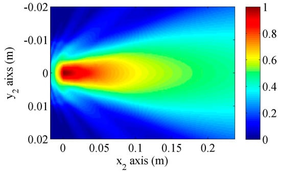 The normalized magnitudes of the received results in the lateral direction at propagation distances of x2 = 0.05, 0.1 and 0.15 m are indicated in Figure 8c. The results show that the maximum value exists at the central axis, and these magnitudes decrease quickly when the transducer moves away from the central axis. Compared with the lateral results shown in Figure 7b, it is found that the received magnitudes using the angle wedge transducer have very smooth behaviors, and the effects of side lobes are insignificant.