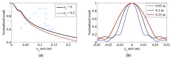 In this simulation, two same angle beam wedge transducers are used as the transmitter and receiver. Their parameters are the same as described above. Although it is well known that the leaky Rayleigh wave will attenuate severely, there is no exact attenuation coefficient to account for the lost energy numerically yet. Here, in order to investigate the effect of leaky Rayleigh wave attenuation, we show the normalized received average magnitudes in the propagation distance of x2 = 0.1 m, but using different leaky wave attenuation coefficient values. The results are shown in Figure 8a. It can be seen that the received magnitudes will be much smaller when a larger attenuation coefficient is used. The normalized received average magnitudes in different propagation distances using different leaky wave attenuation coefficient values ( = 0, 10, 40 Np/m) are shown in Figure 8b, but we can find that there are no obvious differences between these normalized results. So we can draw that although the received magnitudes will be much smaller when a large leaky wave attenuation coefficient is used, the leakage does not affect the tendency of the received results in the propagation distance. Compared to the effect induced by the attenuation coefficient of Rayleigh wave, the influence of the attenuation coefficient of the leakage on the distributions of the received results is insignificant, though its value can be much larger than that of Rayleigh wave. Hence, in the following simulations, the attenuation factor for the leaky Rayleigh wave is neglected. If we compare the received results obtained using an angle beam wedge transducer and the on-axis beam distribution, one can clearly see that the decreasing tendencies are different.
