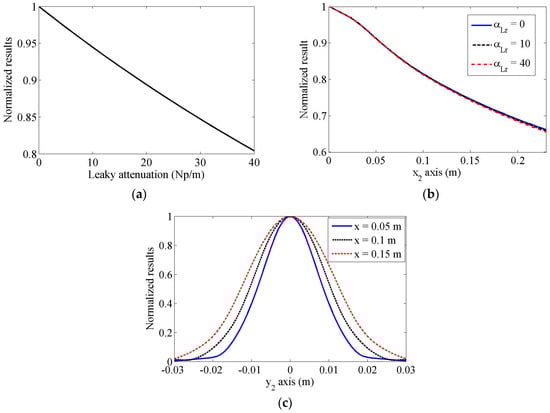 Distributions of normalized magnitudes of received wave results using an angle beam wedge transducer, (a) at the distance of x2 = 0.1 m, (b) along x2-axis, and (c) along y2-axis. Different leaky Rayleigh wave attenuation coefficients are used in (a,b), but attenuation is neglected in (c).