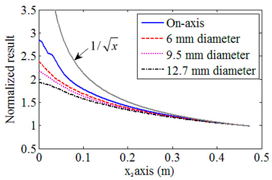 We will discuss the effect of the receiver sizes on the received result distributions. In this simulation, three different sizes of the receiver elements (3, 4.75 and 6.35 mm radii) are used. The other parameters used here will be the same as mentioned previously. The attenuations are neglected as we focused on the magnitude tendency of the received results. Figure 9 shows the simulated results, in which, the on-axis wave beam results and received magnitudes using different sizes of angle beam wedge receivers are included and are normalized by their results for a distance of x2 = 0.45 m. It can be observed clearly from these results that at far distance, all these magnitudes will damp as follows: , which is similar to that observed for cylindrical waves. However, in the near distance cases, these results have different damping tendencies, and a basic discipline is that the results obtained using a smaller size receiver will damp more quickly. These results indicate that the measured Rayleigh wave distributions will be influenced by the receiver size, and it is essential to consider the reception process in the practical measurement.