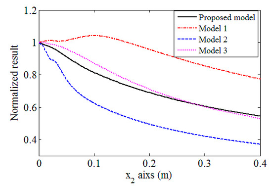 In order to illustrate the importance of considering the beam spreading in the wedge and the receiver size when Rayleigh wave is receipted by an angle beam wedge transducer, the received results predicted by the proposed model are compared with the simulations using other simple methods. In the first simple model (Model 1), the wave propagation and spreading in the receiving wedge are neglected, so that the whole Rayleigh wave values underneath the receiving wedge are numerically added together to yield the received results. In the second model (Model 2), we introduce the on-axis results predicted using Equation (22) as the received results. Since the energy of Rayleigh waves is concentrated on the surface of the substrate and decays exponentially with depth, Rayleigh waves on a free surface can be expressed in a general form with a 2-D wave equation. A line source is usually used to model the Rayleigh wave beams and account for the beam spreading behaviors [2,17,35]. Therefore, in the third model (Model 3), the angle beam wedge transmitter is replaced by a Gaussian distributed line source, and the calculated on-axis results are used as the received results, which is described in the reference [26].