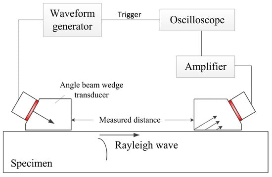 The experimental setup using the angle beam wedge transducers to generate and receive Rayleigh wave is depicted in Figure 11. A basic summary of the measurement follows here. The generating system is an acrylic wedge (ABWSL-1045, Olympus) coupled with an ultrasonic generating transducer (V404, Panametrics, Waltham, MA, USA, center frequency of 2.25 MHz and 6.35 mm radius), excited by an waveform generator (33611A, Keysight Technilogies, Inc., Santa Clara, CA, USA). The parameters of the angle beam wedge transducer are the same as those in the simulation section, and only half of the footprint is covered by the wedge. The input pulse shape was a 2.25 MHz sine wave modulated by a rectangular window of 30 cycles, so that Rayleigh wave with narrow band can be obtained. In the reception port, the angle beam wedge transducer is the same as the one in the transmission port. Rayleigh wave propagates on an Al-6061 surface and will be received by the receiver. The signal is amplified by a pulser-receiver (Panametrics-NDT 5072PR, Panametrics, Waltham, MA, USA) and digital using a Waverunner oscilloscope (TBS1154, Tektronix, Inc, Wilsonville, OR, USA). Light oil is used to couple the transducers to the wedges, as well as the wedges to the specimen. During the experiment process, the transmitter is fixed and the receiver is replaced when the propagation distance changes.