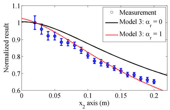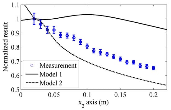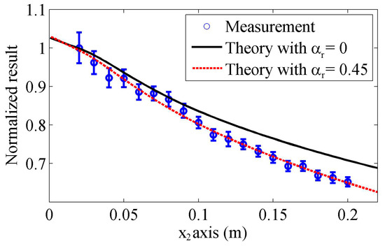 The normalized experiment results will be compared with the theoretical predictions using different models. Figure 12 compares the measurements and the predictions using our proposed model. The experiment results show the average and the standard deviation of five measurements. As we have analyzed in Section 3, only the attenuation of Rayleigh wave affects the distributions of the received wave results. Hence, in the predicted results, different Rayleigh wave attenuation coefficients are used: and 0.45 Np/m. In the first case, the attenuation is neglected, while the second attenuation coefficient is extracted by fitting the predictions and average measured results. It can be observed that the measured results are in good agreement with the predictions when the attenuation is considered. The correlation coefficient between the predictions and measured average results is 0.98. Note that it is easy to distinguish the differences caused by attenuation and wedge geometry or receiver size in the simulated results, as in the propagation distance, the attenuation effect can be modeled using an exponential decay but the measured Rayleigh wave distribution behaviors are determined by the transducer geometry. Therefore, the agreement indicates the proposed model is effective in accounting for the wave spreading and receiver size.