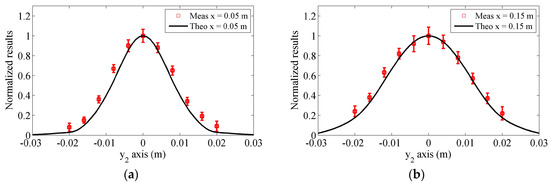 The received results in the lateral distance from −0.02 to 0.02 m will be measured at propagation distances of 0.05 and 0.15 m, respectively. The distance gap used in the measurements is selected as 4 mm. Figure 15a,b compares the experiment results with the predicted results obtained using the proposed model when the propagation distances are 0.05 and 0.15 m, respectively. In the theoretical predictions for each case, all of the attenuations are neglected because the wave propagates a same distance. It can be found that in the lateral position, the measured results will decrease smoothly, coinciding with the predicted results. In addition, because the main sound beams become wider in the longer propagation distance, the magnitudes of the results will decrease slowly in the lateral distance. Generally speaking, the proposed model can effectively predict measured lateral results. The tiny deviations between the predictions and measurements may be caused by the inaccuracy of the equipment and measurement errors.