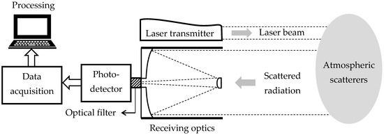 Lidar systems consist in general of co-located transmitter and receiver sub-systems, with fast photodetectors and acquisition electronics. The basic layout of a lidar is shown in Figure 1. For aerosol remote sensing the transmitter is usually a pulsed laser and the receiver an optical assembly with a telescope which acts as a collector of the backscattered radiation. The optical signal is then filtered to reduce the background-radiation induced noise, converted into an electric signal by means of a fast photodetector, amplified, digitized and recorded for later processing.